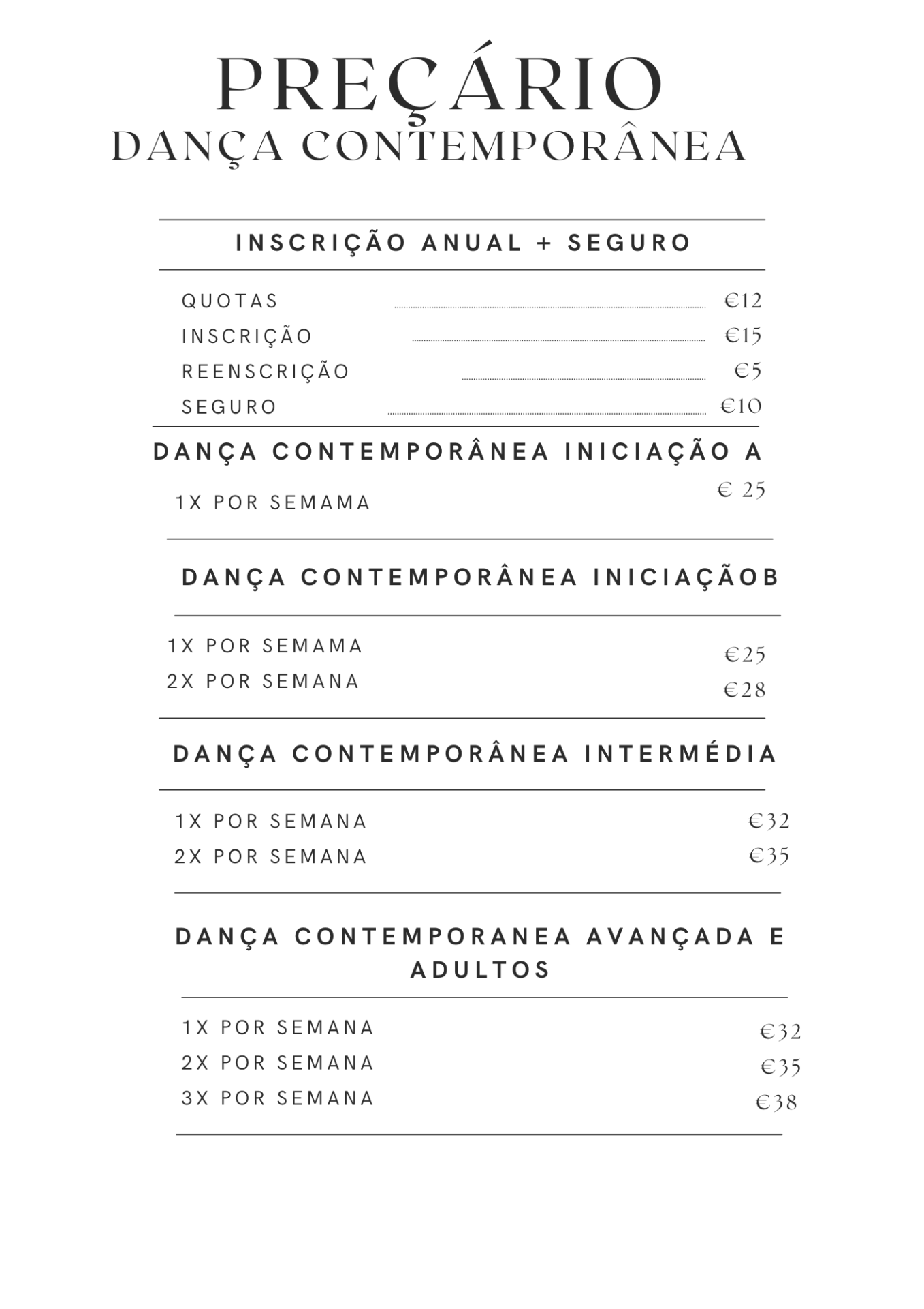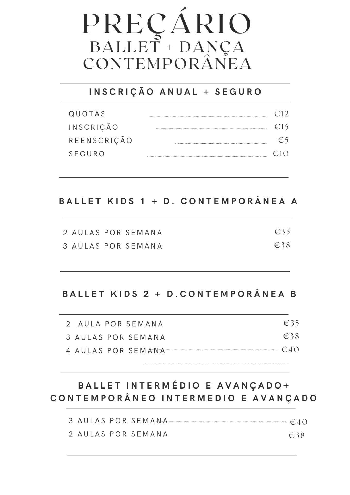 • As mensalidades já incluem, sem custos adicionais, as aulas de Pontas e de Barra no Chão para todos os alunos de Ballet e Dança Contemporânea. Apenas os alunos externos têm custo adicional na modalidade de Barra no Chão.